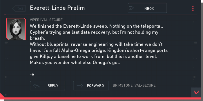 This email goes further into the specifics of the bridge, describing how Killjoy is trying to reverse-engineer the portals present at Everett-Linde. While these long-range portals are somewhat similar in design to the short-range ones that are seen on both the Range and Bind, they are far more complex, and will take a lot more effort to create. As of now, Killjoy has hit a roadblock.