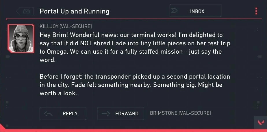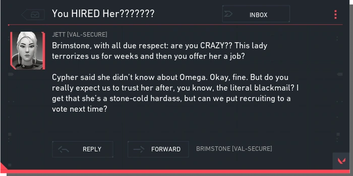 In contrast to Cypher's Voicemail, this Email from Jett voices a negative opinion towards hiring Fade into the PROTOCOL, one which is no doubt shared by many of the other members. Understandably angry, Jett proceeds to rant about how it was unreasonable to expect the team to trust and rely on Fade after she had so callously blackmailed them all.