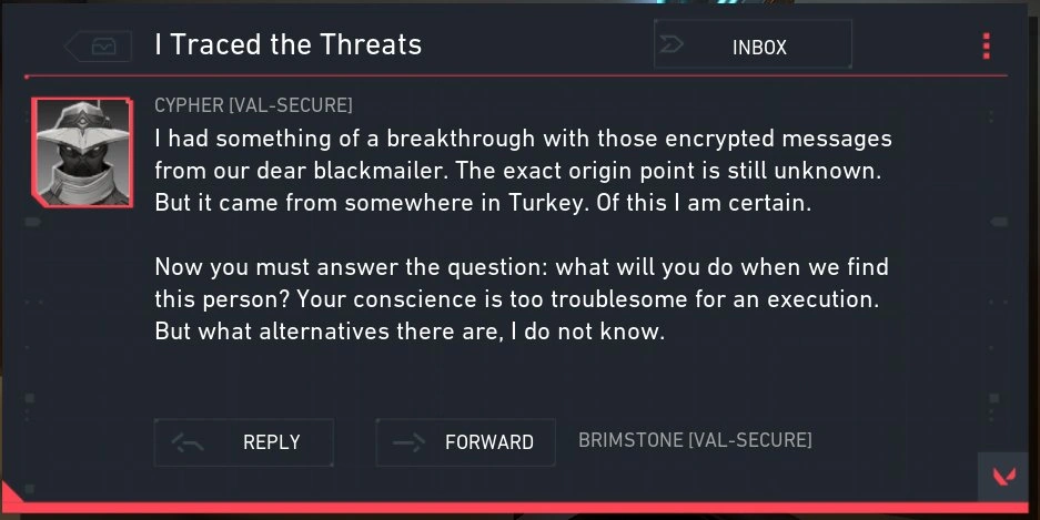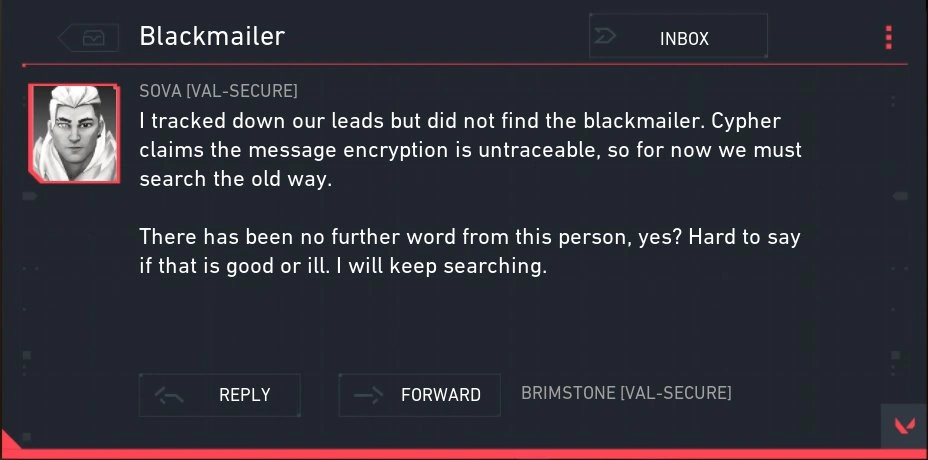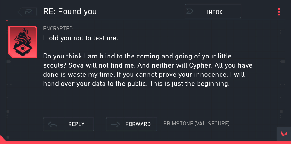 Brimstone has got the team working on finding the sender of the previous email, Fade. Sova and Cypher are both on the hunt, but so far they have found nothing. For the second time now, the VP is faced with someone whose secrets even Cypher can't get to.