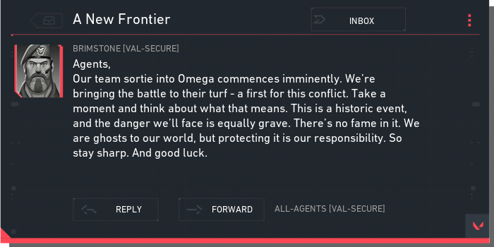 While the trip into Omega is certainly a momentous occasion, Brimstone makes a point to reaffirm the PROTOCOL's anonymity to their world - they perform a vital, but still thankless, job. This could have been some light foreshadowing for the radically different conditions in Omega Earth, given the fame and stardom that the VALORANT LEGION enjoys.