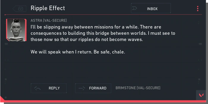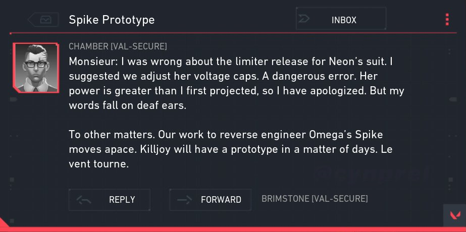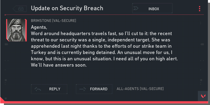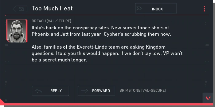 This voicemail goes together with the Email sent in the same patch, discussing how the VP is preparing to fight back against Fade and her blackmailing. It is in response to a request made by Brimstone to Sova, asking him for a list of Agents to send against her. Sova lists off a team, comprising of himself, Cypher, Chamber, Breach, Neon, and KAY/O. Together, he plans for the team of six to go and apprehend Fade.