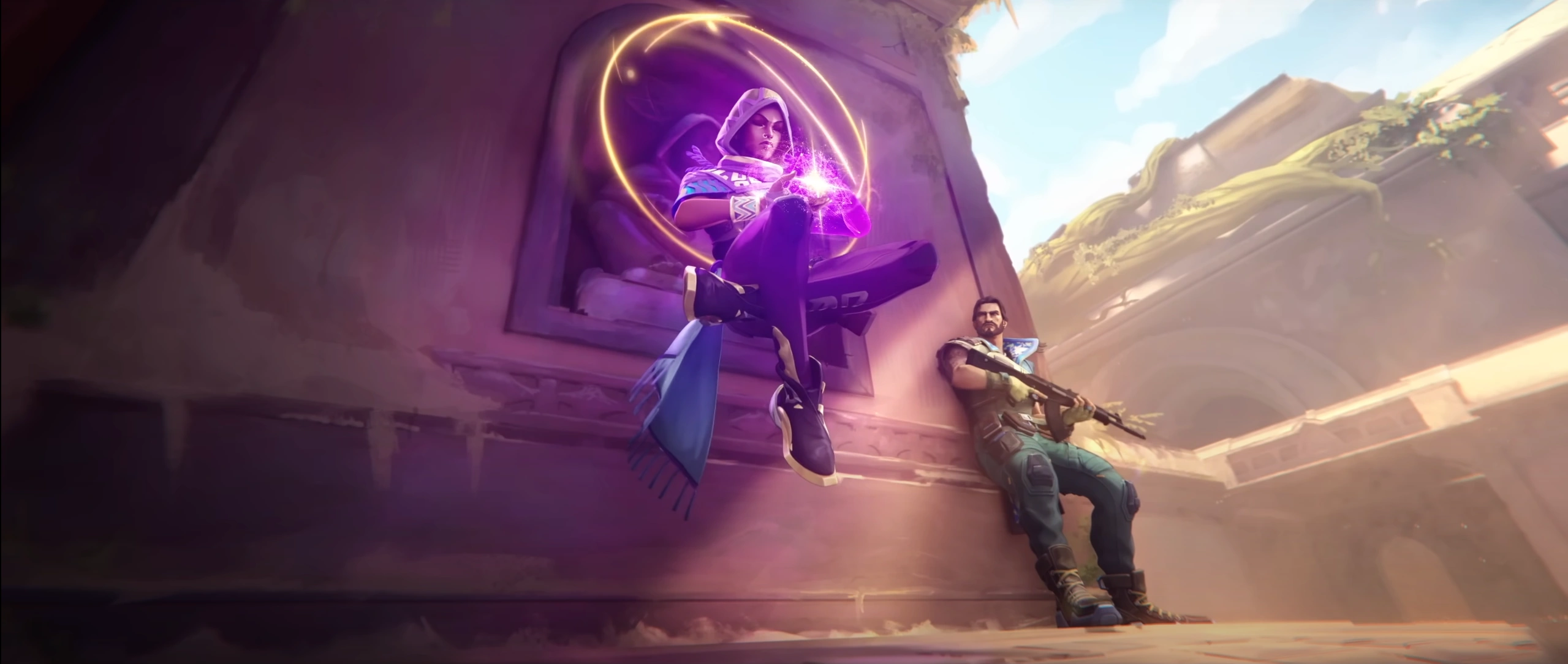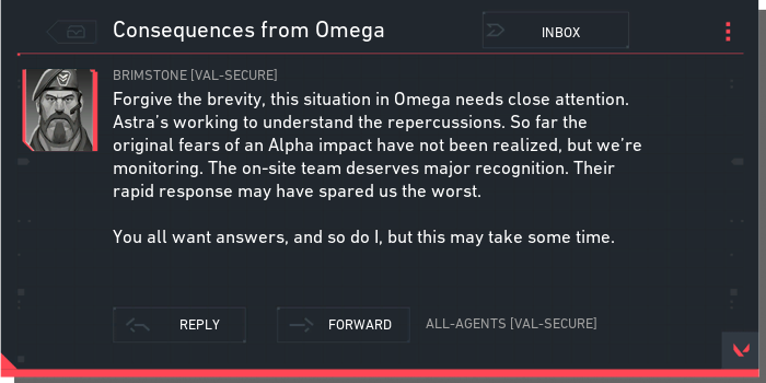 The trailer begins moments after the end of REVELATION, with α-Harbor and α-Astra battling Ω-Fade, Ω-Jett, Ω-Sage, Ω-Killjoy and Ω-Raze. The Alpha agents are hiding behind cover as they request support from α-Brimstone. Brimstone requires information about the location before he can come to help, and so Astra uses her Astral Form to scout out the map. Harbor uses his Cove to shield Astra while she uses her abilities.
