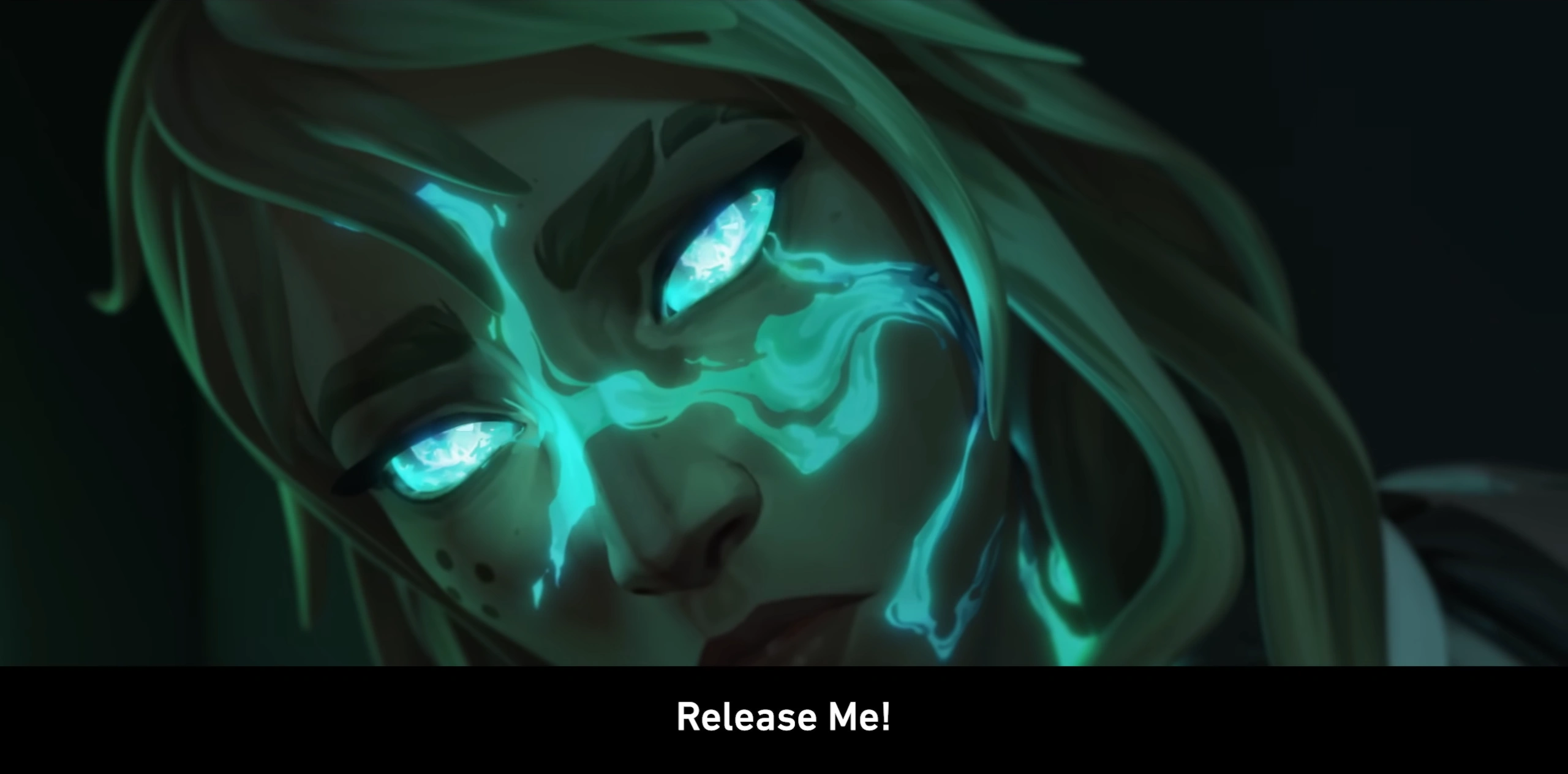 Glowing marks cover Deadlock's face as her eyes glow blue and the bear says "Release Me!"