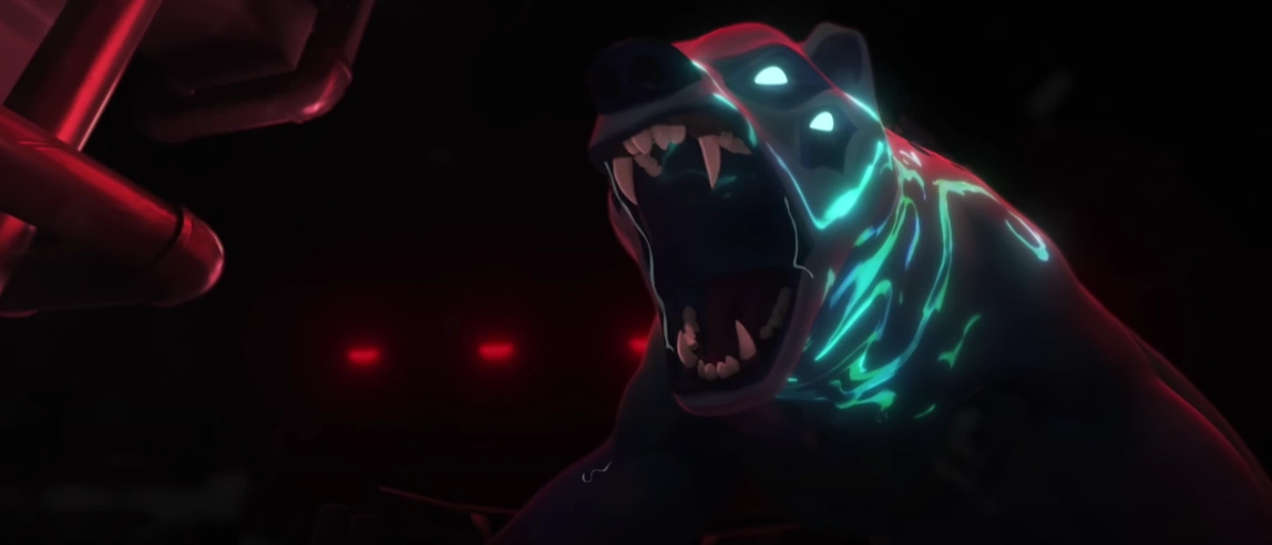 Being the only hunter left alive, Deadlock has to face the creature alone. Although she runs out of ammunition, Deadlock lures the bear into a less secure containment unit, ensnaring it with her GravNet ability. She runs out of the cylindrical enclosure and attempts to lock the creature in, however, the process isn’t fast enough. After the bear breaks through the nanowire mesh, it bites Deadlock’s left arm through the closing doors, both immobilizing her and blocking the gates of the enclosure from shutting.